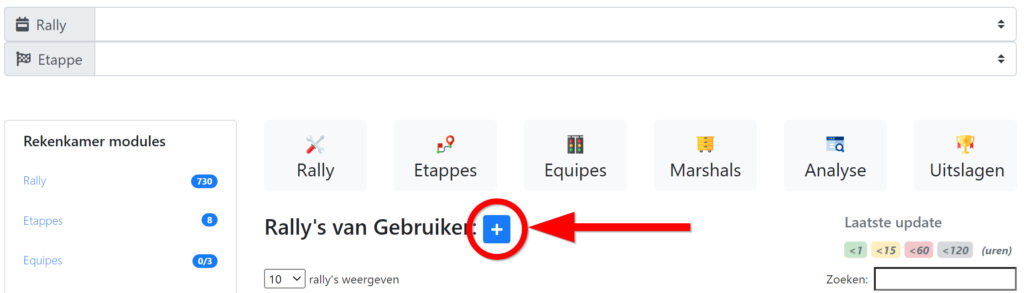 Klik voor het aanmaken van een nieuwe rally op de blauwe plus bovenaan het overzichtsscherm met alle rally’s;