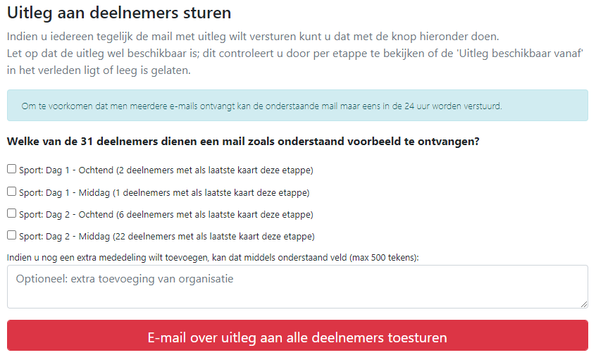 Indien gewenst kan na afloop van de rit ook een uitleg mail aan alle deelnemers worden toegestuurd. Onder de Rally op de overzichtspagina zit een grijze knop hiervoor.